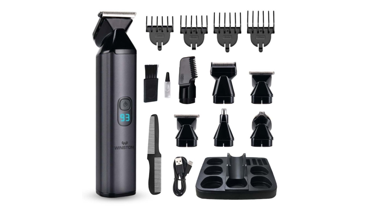 The Winston Groom 360 trimmer offers a comprehensive grooming solution for men, combining six different attachments in a single device. This 6-in-1 kit includes tools for nose trimming, beard shaping, body grooming, precision detailing, hair clipping, and foil shaving, catering to a wide range of grooming needs.