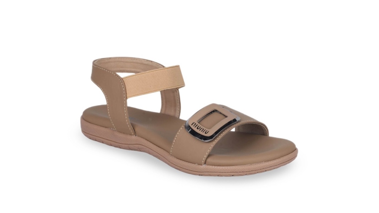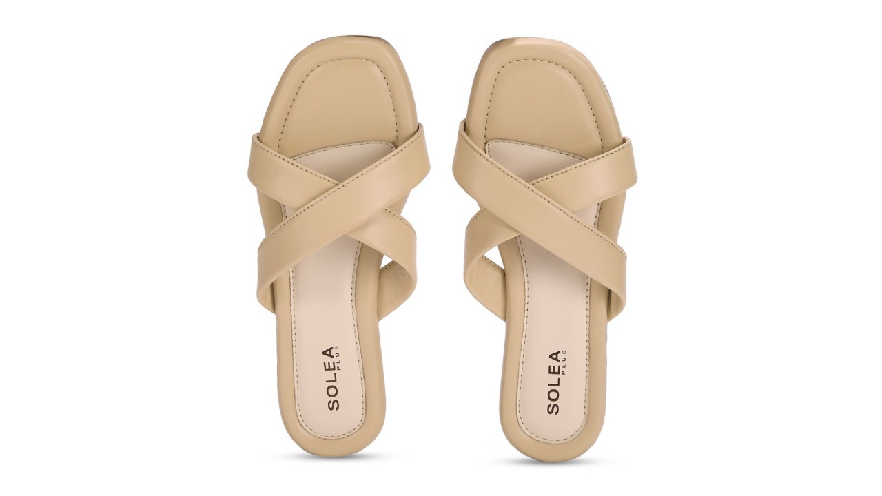 These beige open-toe flats feature a cross-strap design and are lightweight and durable. They have a synthetic upper and a cushioned footbed for comfort. The outsole is textured and patterned, made of TPR. Paragon provides a 1-month warranty on these flats. To care for them, simply wipe them with a clean, dry cloth to remove dust.