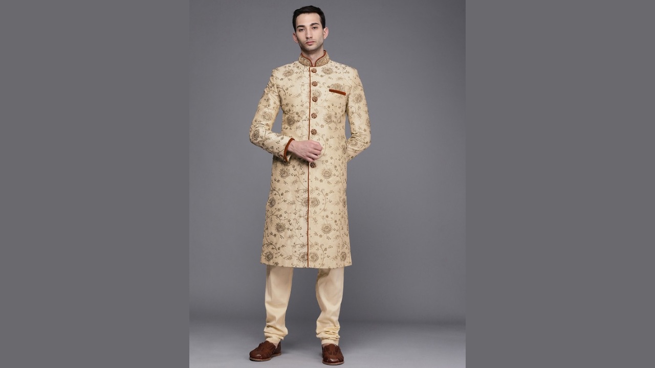 | 4. | Manyavar Men Beige Floral Embroidered Sherwani and Churidar Set | Floral Embroidery |