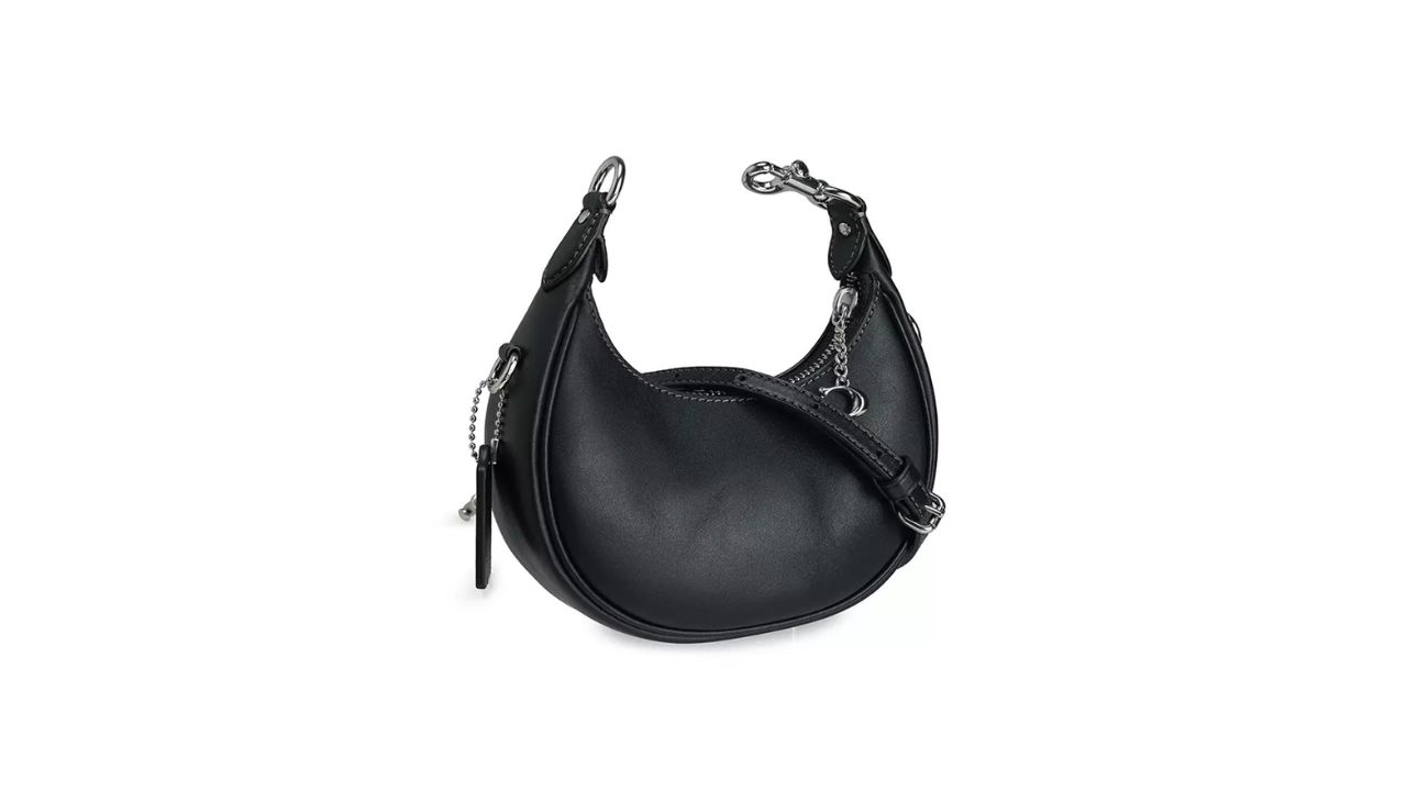This crescent-shaped shoulder bag comes in a solid color. It is made from cow leather and has a main compartment with a zip closure and a lined interior. It includes a detachable logo tag, a detachable main top handle, and a detachable and adjustable shoulder strap for various carrying options. The approximate dimensions are 16cm in length, 9cm in height, and 6cm in width.