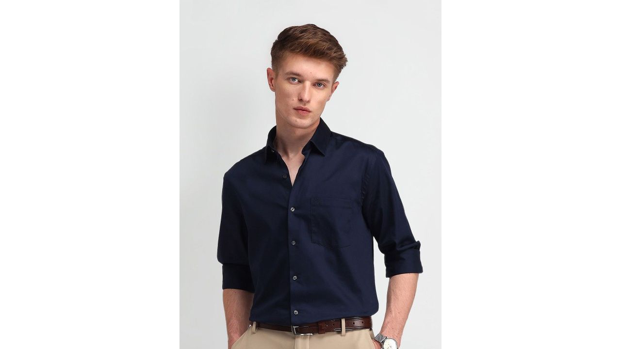 This navy formal shirt from Arrow gives you a modern, tailored look with its slim fit. The collar has a wider spread that looks really good with a tie. It buttons up the front, and there’s a simple pocket on the chest. The sleeves are long and fit well, and the bottom has a curved hem, so it looks smart tucked in. Being 100% cotton, it’s comfortable to wear. Plus, it’s easy to care for – just machine wash it.