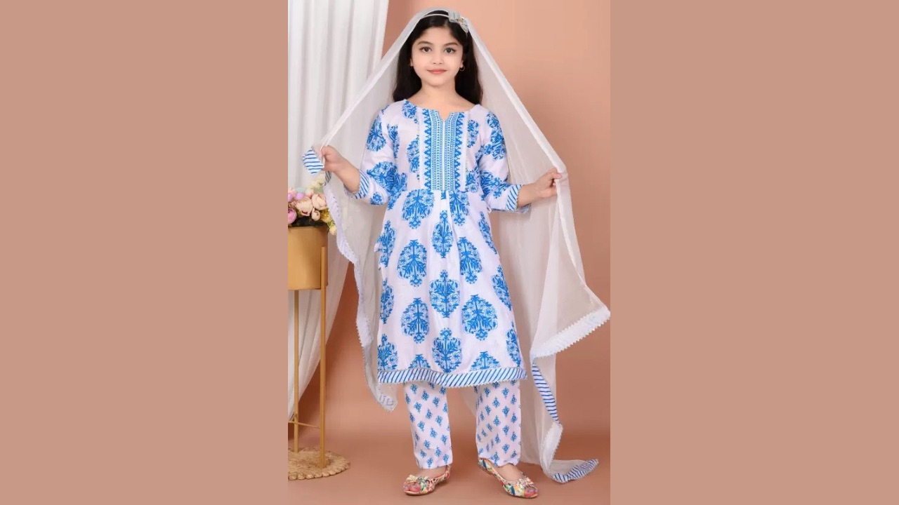 Available for ₹410, this set includes a kurta, pyjama, and dupatta designed for casual wear. The ensemble offers a complete traditional look, suitable for daily activities or informal events.