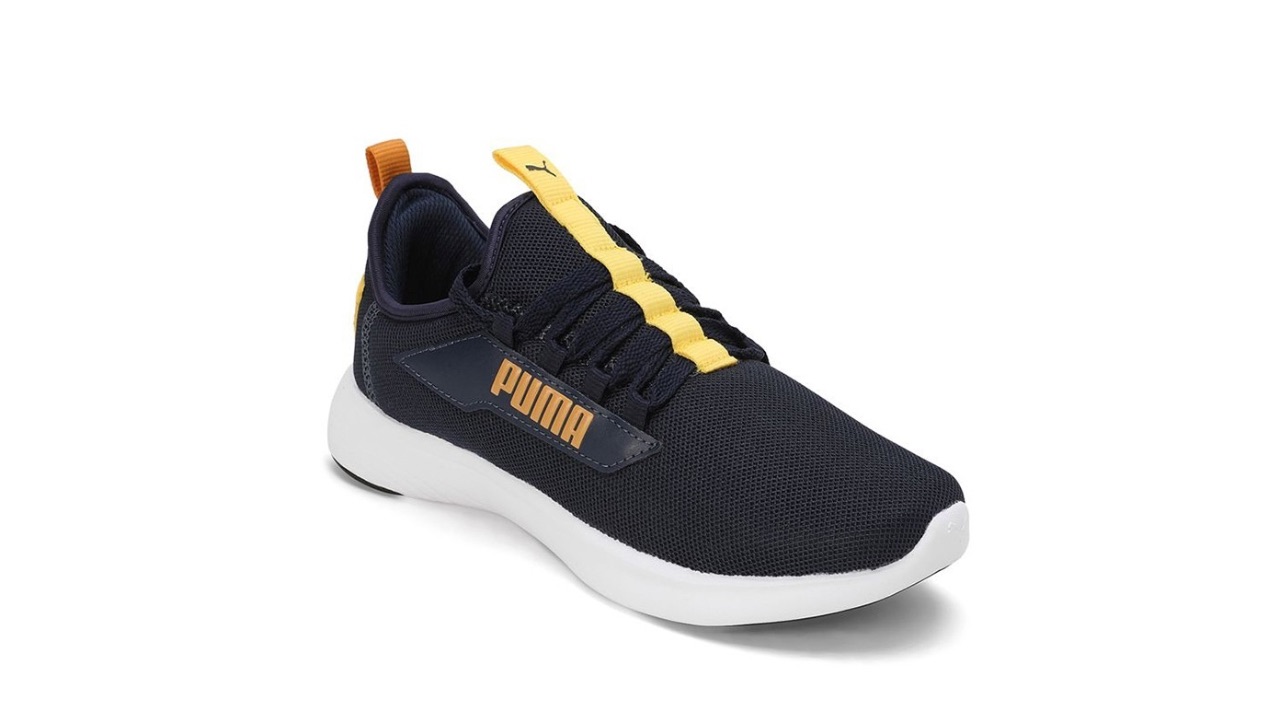 These navy blue and yellow sports shoes for youth feature a logo print detail, a round toe, and a regular style with a lace-up closure. They incorporate SOFTRIDE technology for cushioning and have a textile upper with a cushioned footbed and a rubber outsole. The brand provides a 3-month warranty. The textile upper molds to the foot for a snug and comfortable fit, while the zoned rubber outsole offers excellent traction and durability. They have a classic style with PUMA branding and a SoftFoam sockliner for cushioning. These shoes are suitable for road running with neutral pronation, medium cushioning, and are designed for medium distances on all-round surfaces.